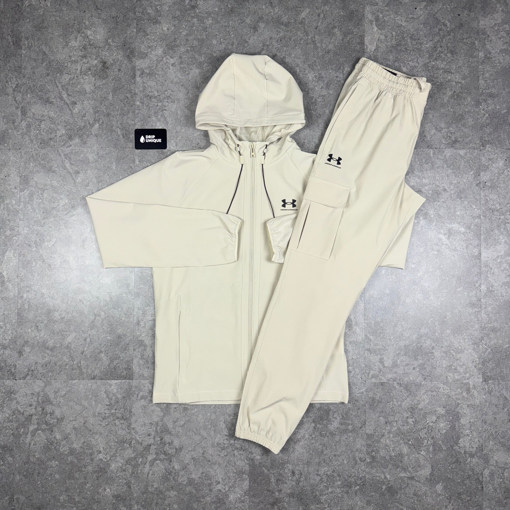 Level up your wardrobe with the new Under Armour Woven Tracksuit in a Stone Colourway. This Under Armour Tracksuit offers a comfortable, relaxed fit with large pockets and additional cargo style pockets on the side. The Elasticated cuffs ensure you have a snug and secure fit and the lightweight, breathable material keeps you cool and dry, making this a must have set for any occasion.